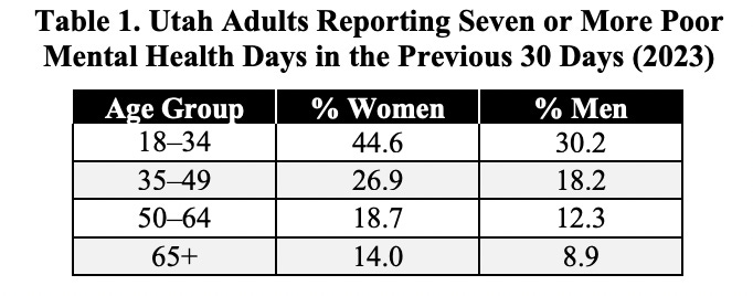 A study from Utah State University found that 45% of Utah women aged 18-34 reported more than 7 days of poor mental health over the previous 30 days.